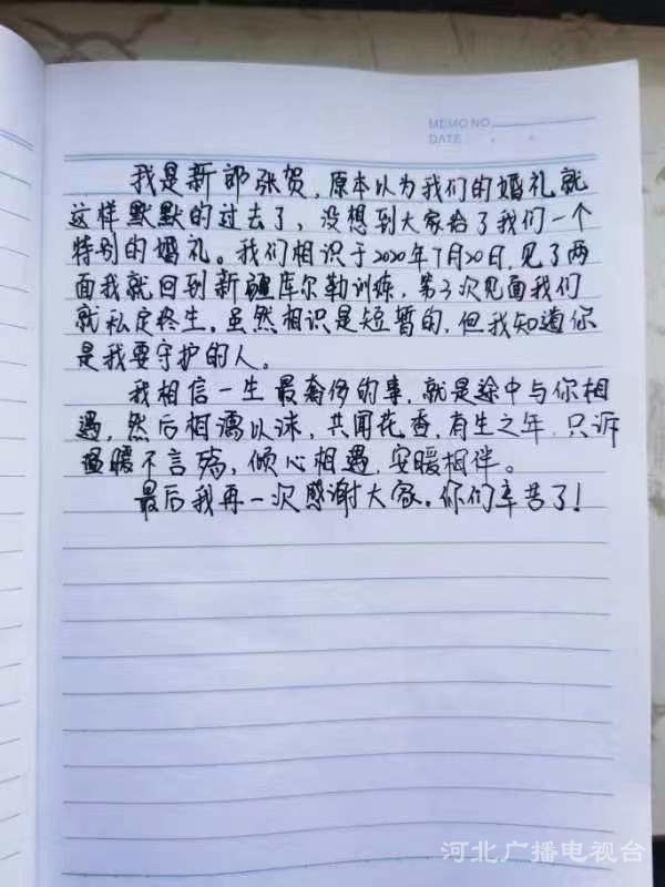 “雖然相識短暫,但我知道你是我要守護的人。我相信一生最奢侈的事,就是途中與你相遇,然后相濡以沫,只聞花香,有生之年,只訴溫暖不言殤,傾心相遇,安暖相伴。”雖然張賀因工作特殊不能參加“云婚禮”,但隔空傳來的真誠感言,令姜英天濕了眼眶。僅10分鐘的小儀式結束后,姜英天匆匆掛了電話,與隊友們又投入了緊張的任務中。