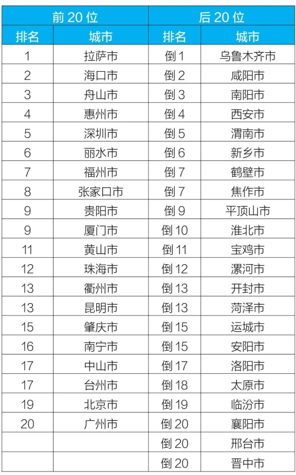質量排名前20位和后20位城市名單