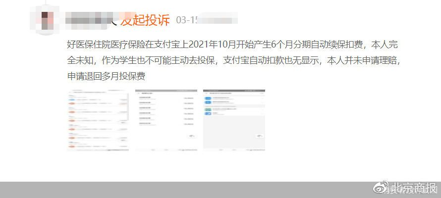 3月15日,有用戶投訴表示:“好醫保在支付寶上2021年10月開始產生6個月分期自動續保扣費,本人完全未知”,也有用戶質疑稱,螞蟻保好醫保門診險自動購買并扣費。