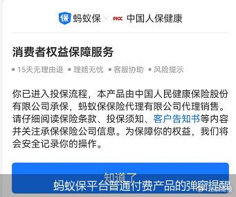 一般而言,消費者在互聯網渠道投保時,在投保頁面首頁會出現類似“您已進入投保頁面”的彈窗提醒。記者在調查中發現,螞蟻保平臺的其他付費保險產品,都會在投保頁面首頁提示“你已進入投保流程,本產品由某某公司承保……”