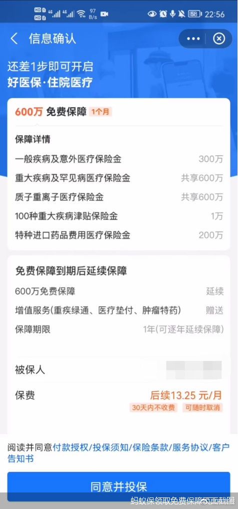 在領取好醫保·住院醫療險時,記者發現,張麗所描述的免費領取保障確有其事。但免費領取頁面標明:“免費保障到期后會延續付費投保”,并標注了保費金額。但對于“免費保障到期后會延續付費投保”的情況,頁面并沒有勾選“是”或“不是”的選擇按鈕,只有“同意并投保”一個選項。
