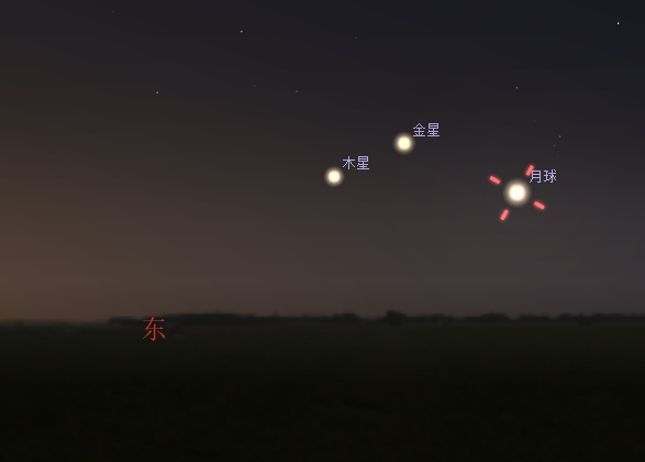 △4月27日凌晨木星、金星、月球相對位置示意圖圖源:星圖軟件