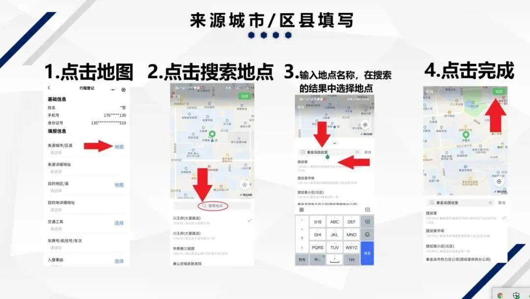 2、行程填報。要求來唐人員如實填報:出發地、目的地、交通工具信息、來唐事由以及體溫等信息。其中,出發地和目的地可通過地圖選擇相應位置后自動完成錄入。其余信息應由人員自行填報。