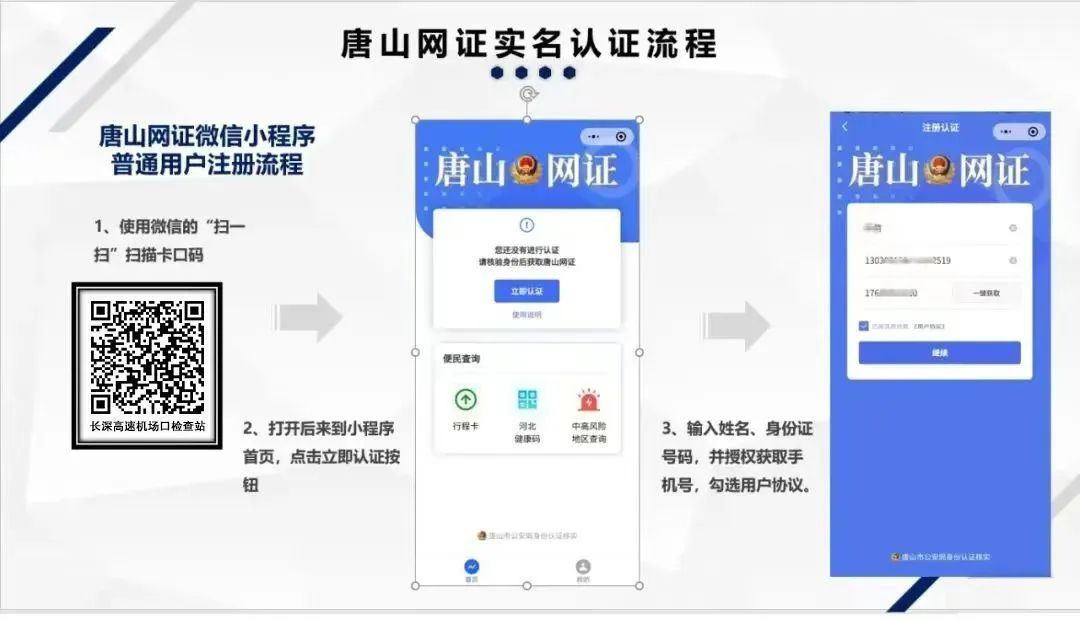1、掃碼注冊。進出人員,在疫情查控站點,通過微信“掃一掃”,識別進出站點設置的行程登記二維碼,通過提示實名注冊“唐山網證”。已實名注冊“唐山網證”人員直接進入行程登記頁面。