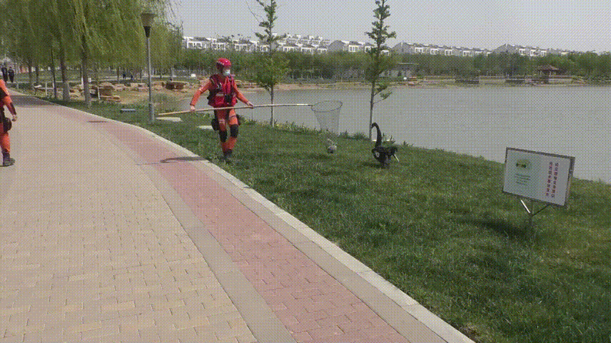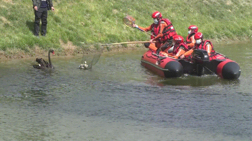 消防救援人員駕駛橡皮艇攜帶抓捕工具靠近黑天鵝,將三只小黑天鵝抓住后,引誘成年黑天鵝靠岸,待時機成熟后,成功將兩只成年黑天鵝抓住,送至植物園安全水域。