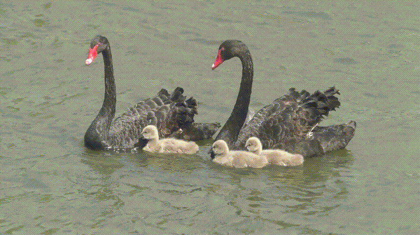 目前,黑天鵝一家五口已經回到植物園家中,開心地游來游去了~