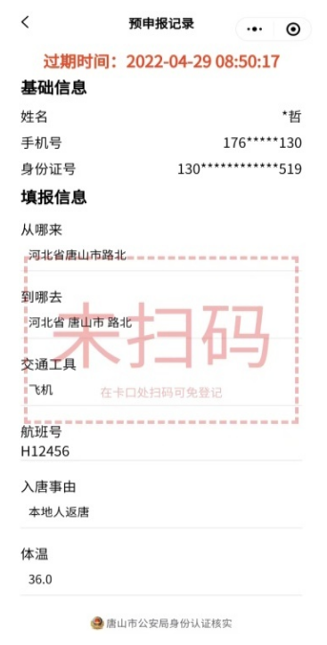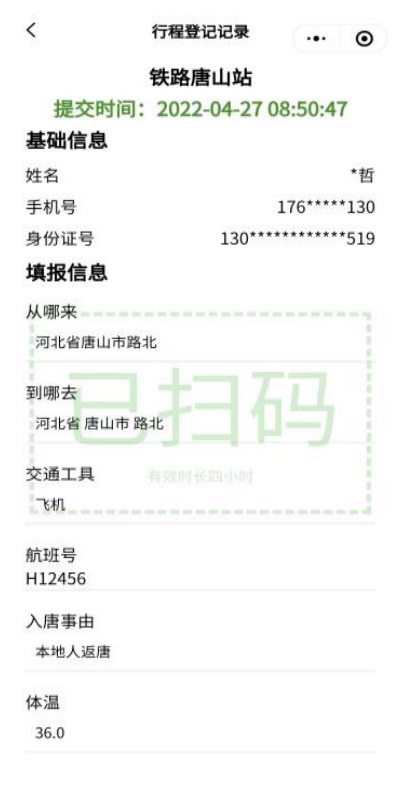 5.預申報成功后,在進入唐山區域疫情防控檢查站掃描現場“行程登記二維碼”完成行程確認