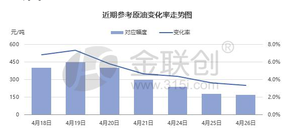 據卓創資訊數據監測模型顯示,截至4月26日收盤,國內第9個工作日參考的原油變化率為3.49%,預計汽柴油上調幅度為145元/噸,折算為升價,92號汽油上調0.11元/升,95號汽油及0號柴油均上調0.12元/升。