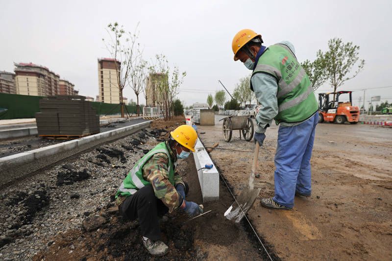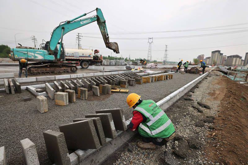 4月28日,中鐵十一局的工人在雄安新區(qū)容西片區(qū)奧威路施工。