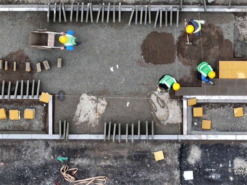 4月28日,中鐵十一局的工人在雄安新區(qū)容西片區(qū)奧威路施工(無人機(jī)照片)。
