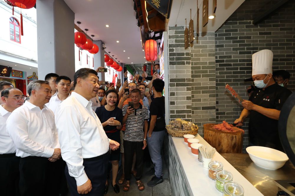 在潮州牌坊街,習近平總書記沿街步行,看商鋪、問物價,同當地群眾親切交流,了解歷史文化街區保護、統籌疫情防控與復商復市等情況。