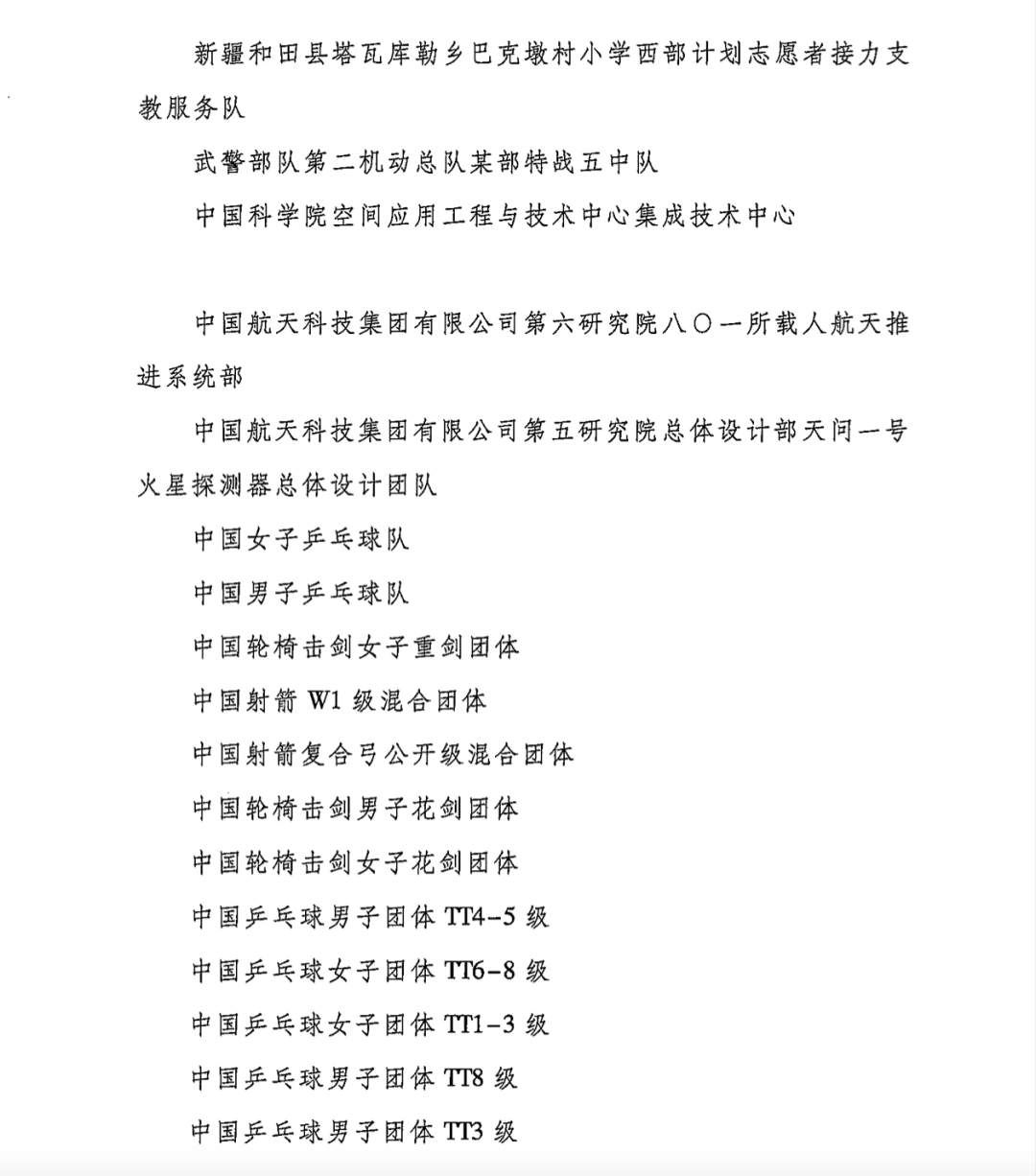 以下為第26屆中國青年五四獎章集體名單: