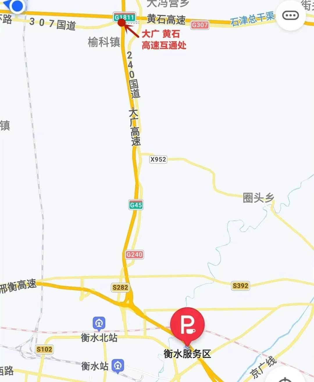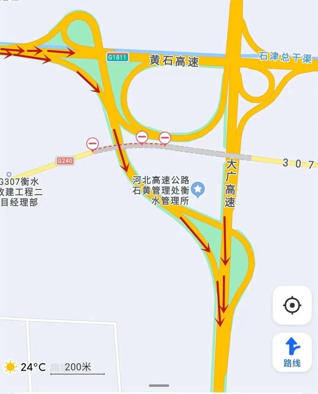 大廣高速北京方向轉黃石高速石家莊方向互通(K1541)處,車道由4變3,且由于大廣轉黃石黃驊方向出口還需向前行駛500米,司機如未看清指示牌,行至此處易生猶豫或突然變道,引發交通事故。